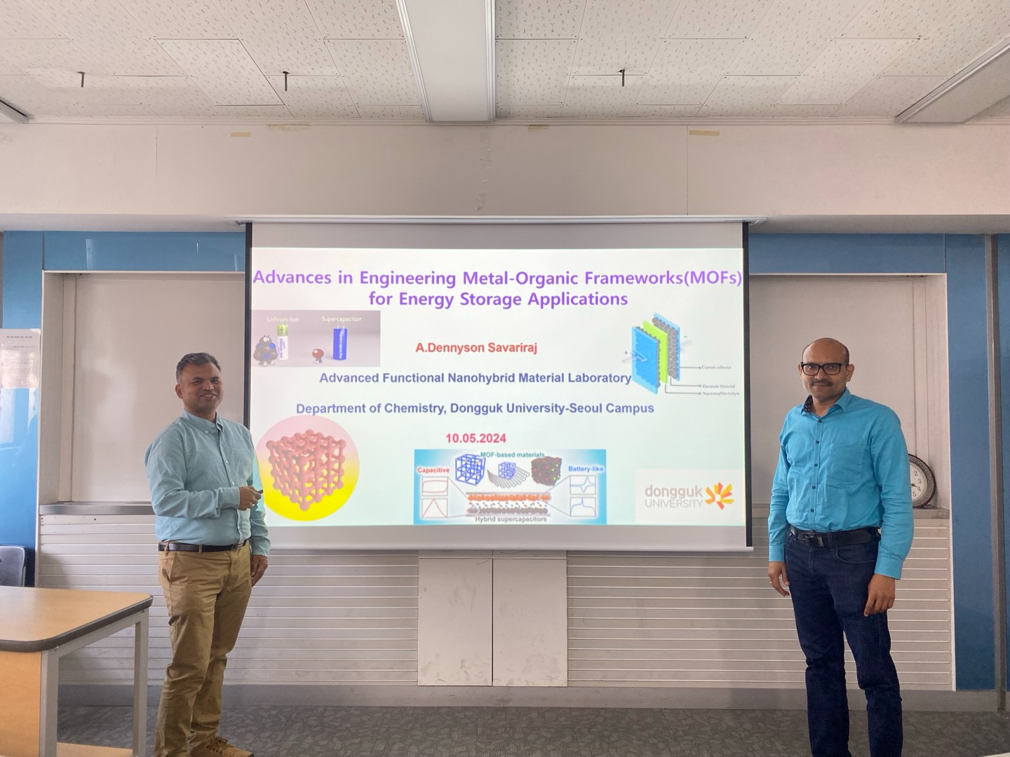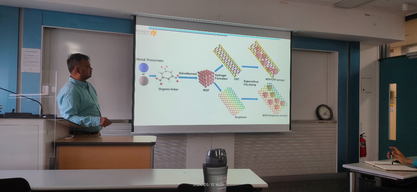 Invited talk on "Advances in Engineering Metal-Organic Frameworks (MOFs) for Eenrgy Storage Applications" by Professor Antonysamy Dennyson Savariraj from the Department of Chemistry at Dongguk University, Seoul, held on May 10, 2024, under the BK21 Seminar program.